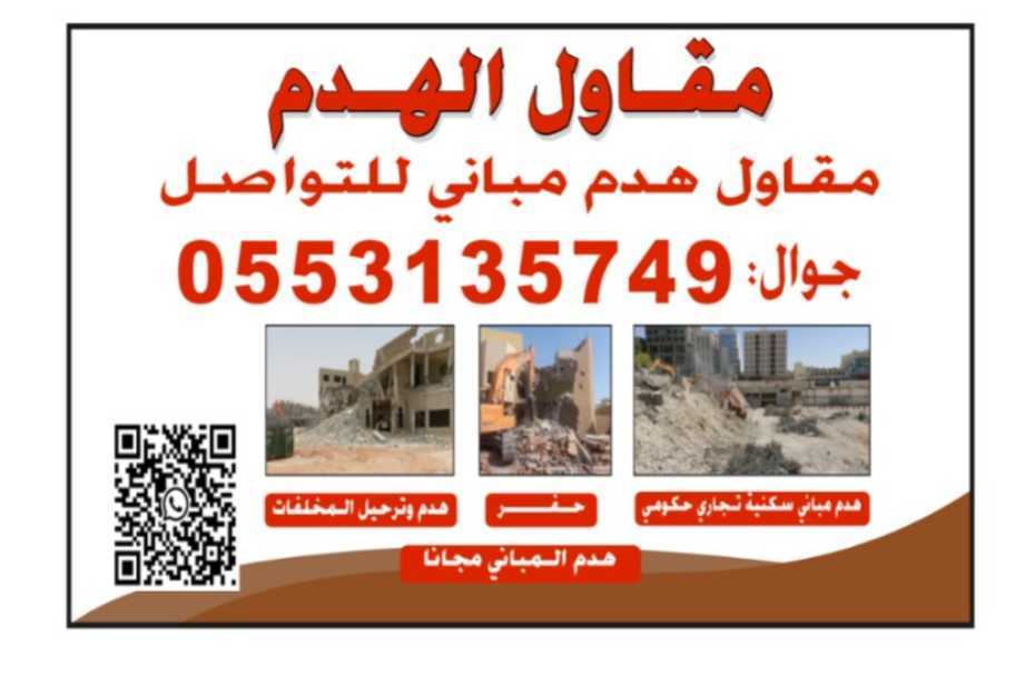 نحن مؤسسه معتمده ومصنفه وفق أعلى معايير السلامه لهدم المباني السكنية والتجاريه والحكوميه مقابل السكراب والمحتويات ودفع مبالغ للمالك نقوم باستخراج الرخصه وهدم المبنئ مع…