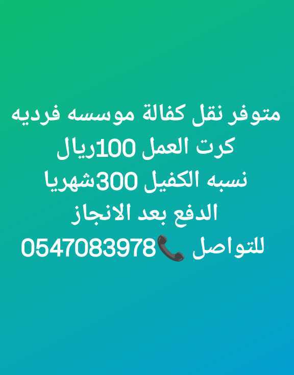 متوفر نقل كفالة موسسه فرديه كرت العمل 100ريال نسبه الكفيل 300شهريا الدفع بعد الانجاز للتواصل 📞0547083978